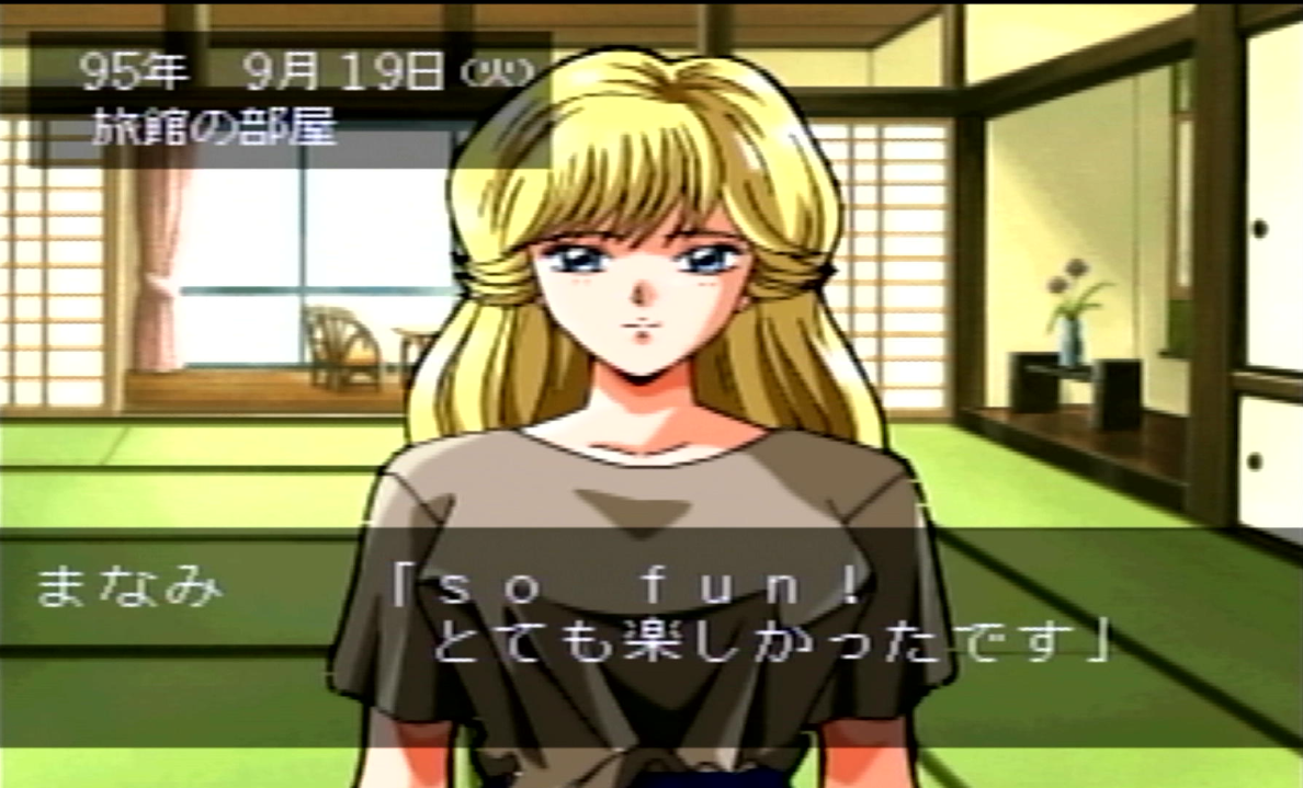 そしてデート先での選択肢は、まなみは日本好きという設定なので和っぽい選択肢があればまず間違いない。あとはアメリカ人とのハーフなのでアメリカンなものも嫌いじゃないのと、性格が真面目だという事を踏まえて選べば正解な確率が高い。中にはどれを選んでいいのかわからない選択肢もあるが、バリエーションが非常に少ないので初見の選択肢の場合は正解を引くまでリセット&ロードを繰り返すのもいい。その手間を少し減らす手助けとして、遊園地ではコーヒーカップ、水族館ではマグロを選べばいいと言っておく。この2つ(他にもいくつかあったが)は何回行っても同じ選択肢しか出ないし、メヴィウスなんかは選択肢すら出てこないからある意味お勧めのデートスポットである